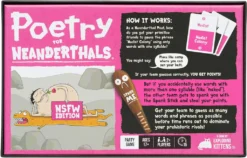 Poetry for Neanderthals is een geweldig partyspel geschikt voor de hele familie. Spelers verdienen punten door als dichtende Neanderthalers hun teamgenoten woorden en begrippen te laten raden. Maar let op: als Neanderthaler ken je alleen woorden met 1 lettergreep… Gebruik je woorden met meer dan 1 lettergreep, dan krijg je van het andere team een klap met de opblaasbare knuppel! Het team met de meeste punten wint!