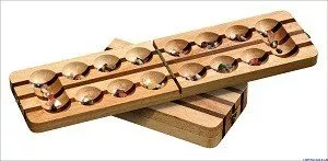 Strategiespel voor 2 personen, opklapbaar speelbord, uitgevoerd in Walnoot en Hevea hout, met diverse half-edelstenen, afmetingen 490 x 125 x 20 mm.