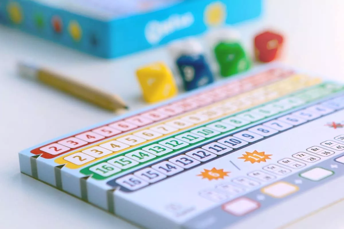 Iedereen heeft een eigen scoren block blad met daarop 4 kleuren sporen met getallen. Door goed te dobbelen en goed opletten welke dobbelstenen de andere spelers beschikbaar laten, probeer je zoveel mogelijk getallen af te kruisen.